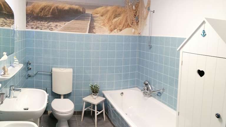 Die Ferienwohnung umfasst drei Schlafzimmer, eine voll ausgestattete Küche mit Kühlschrank und Geschirrspüler sowie zwei Badezimmer mit Dusche und Haartrockner. Zur Unterhaltung stehen ein Flachbild-TV, ein Blu-ray-Player, ein DVD-Player und ein CD-Player bereit.