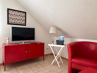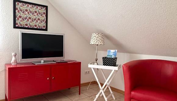 Die Ferienwohnung verfügt über ein Schlafzimmer, ein Badezimmer und ein Wohnzimmer, das mit einem Flachbild-TV ausgestattet ist.