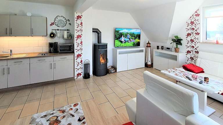 Die Ferienwohnung umfasst ein Schlafzimmer, ein Wohnzimmer und eine voll ausgestattete Küche, die mit einem Kühlschrank und einer Kaffeemaschine ausgestattet ist. Zu den sanitären Einrichtungen gehört ein Badezimmer mit einer Dusche und einem Whirlpool. Des Weiteren ist ein Flachbild-TV mit Kabelkanälen vorhanden.