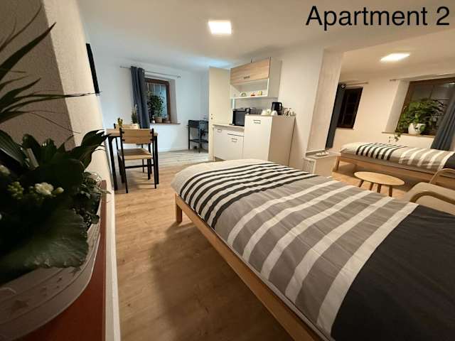 Die Ferienwohnung verfügt über 1 Schlafzimmer, eine voll ausgestattete Küche mit Kühlschrank und Mikrowelle sowie ein Badezimmer mit Dusche und Haartrockner.