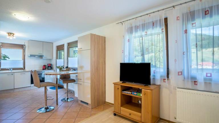 Die Ferienwohnung verfügt über 1 Schlafzimmer, 1 Badezimmer, eine voll ausgestattete Küche, einen Fernseher sowie eine Terrasse mit Gartenblick. Handtücher und Bettwäsche sind ebenfalls vorhanden.