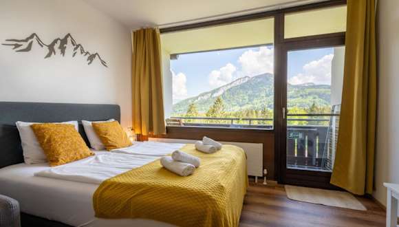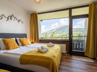 Die Ferienwohnung umfasst ein Schlafzimmer, ein Wohnzimmer sowie einen Balkon mit Bergblick. Zur Ausstattung gehören ein Flachbild-TV, eine gut ausgestattete Küchenzeile mit Kühlschrank und Geschirrspüler sowie ein Badezimmer mit Dusche. Handtücher und Bettwäsche werden bereitgestellt.