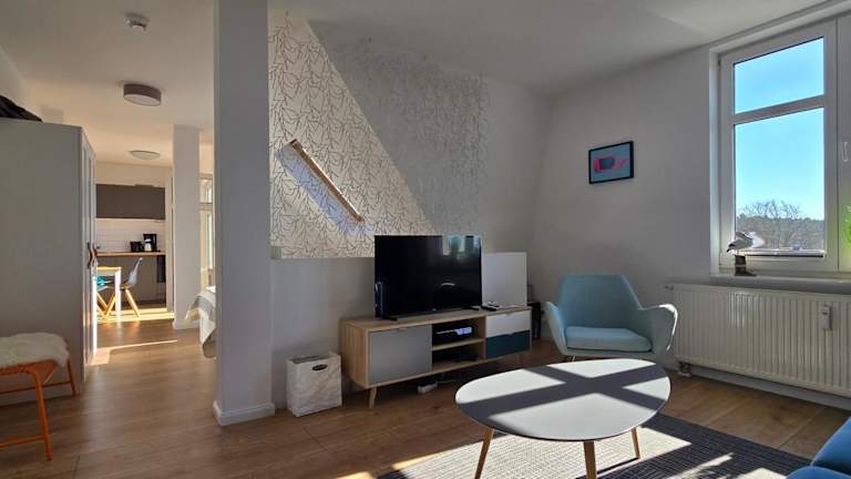 Die Ferienwohnung S40 "Sonnendeck" bietet Übernachtungsmöglichkeiten in einer komfortablen und gut ausgestatteten Umgebung. Die Unterkunft verfügt über einen Balkon und einen eigenen kostenlosen Parkplatz, was zusätzlichen Komfort bietet. Hier stehen kostenfreies WLAN sowie grundlegende Haushaltsgeräte zur Verfügung.
