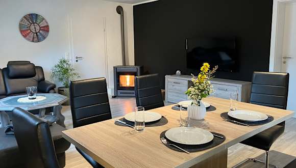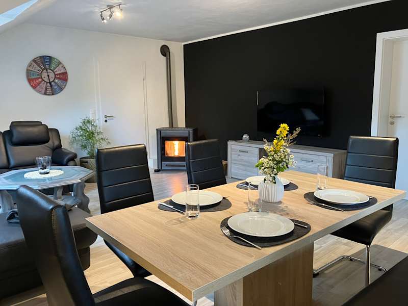 Die Wohnung in der 1. Etage, ist ca. 110 qm² groß und bietet Platz für bis zu 7 Personen. Sie verfügt über einen kombinierten Wohn-/Essbereich mit einem Pelletofen und Smart-TV, einer vollausgestatteten Küche inkl. Spülmaschine, drei Schlafzimmer jeweils mit Smart-TV, ein Bad mit ebenerdiger Dusche und WC, sowie einen überdachten Balkon mit Süd-Ost Ausrichtung. Ein Garten mit Grillmöglichkeiten kann mitgenutzt werden. WLAN steht Ihnen kostenfrei zur Verfügung. Ein Parkplatz vor dem Haus steht ebenfalls kostenfrei zur Verfügung. Ein Garagenstellplatz ist auf Anfrage gegen Gebühr möglich. Unterstellmöglichkeiten für Fahrräder, Motorräder und Skier sind vorhanden. Bettwäsche, Handtücher, Geschirrhandtücher sind im Preis enthalten. Kinderhochstuhl, Kinderbett, Wickelkommode und Kinderbücher/-spielzeug kostenfrei. Haustiere sind nicht erlaubt. Nichtraucherwohnung. Nur auf dem Balkon darf geraucht werden.