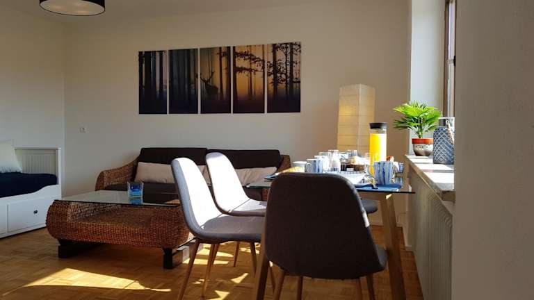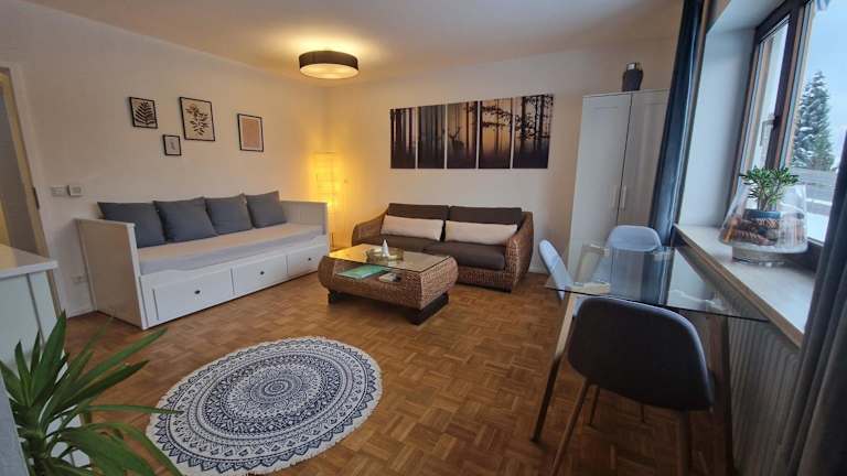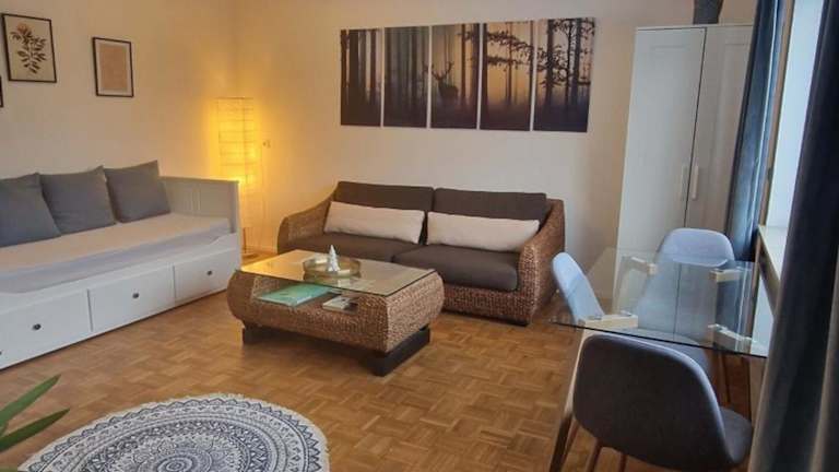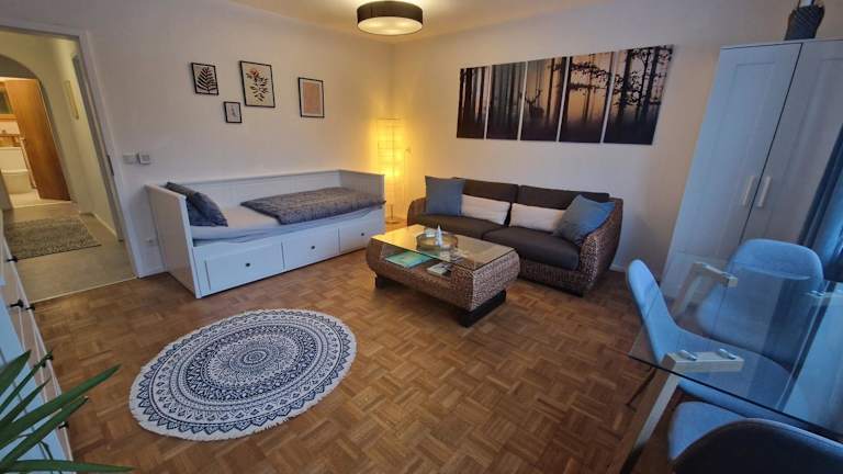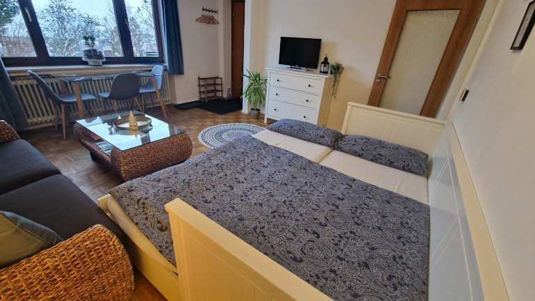 Das Apartment verfügt über ein gemütliches Schlafzimmer, ein modernes Badezimmer mit Haartrockner, ein komfortables Wohnzimmer und eine gut ausgestattete Küche mit Kühlschrank. Handtücher und Bettwäsche werden gestellt, damit Sie sich wie zu Hause fühlen können.