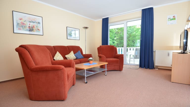 Das sehr komfortabel eingerichtete 2-Raum-Appartement (****Kategorie) mit ca. 66 m² Wohnfläche befindet sich im 1. Obergeschoß mit einem schönen Süd-West-Balkon mit Sonnenliege. Es verfügt über einen Wohnraum mit einer gemütlichen Couchgarnitur, Flachbild-TV mit DVD-Player, Stereoanlage mit CD-Player und einem Schrankbett für 2 Personen. Die separate Küche ist mit einem Esstisch eingerichtet und einer Küchenzeile mit einem Kühlschrank mit Gefrierfach, einem Backofen, 4-Platten-Ceranfeld, Spülmaschine, Eierkocher und diversem Kleininventar, das die Küchenausstattung komplettiert. Ein Schlafzimmer mit Doppelbett, eigenem Fernseher und einer kleinen Sitzgrupe sowie ein modernes Bad mit einer Eckbadewanne gehören ebenfalls zur Ausstattung. Ein Kinderhochstuhl, ein Bügelbrett mit Bügeleisen und ein Tresor stehen Ihnen kostenfrei zur Verfügung. Die Wohnung ist für 1 - 4 Personen ideal geeignet. Wir bitten um Verständnis im Interesse unserer Gäste mit allergischen Beschwerden, dass wir das Mitbringen von Haustieren nicht gestatten.