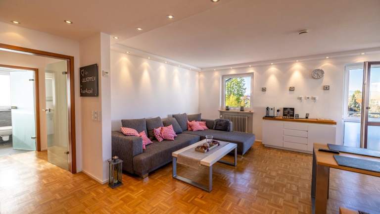 Die Ferienwohnung verfügt über ein Schlafzimmer, ein Wohnzimmer, einen Flachbild-TV sowie eine gut ausgestattete Küche mit Kühlschrank und Geschirrspüler. Es sind 2 Badezimmer mit Dusche vorhanden. Zudem steht ein Balkon zur Verfügung, der Blick auf die Stadt und die Alpen ermöglicht. Handtücher und Bettwäsche werden bereitgestellt. Die Unterkunft folgt strengen Hygiene- und Reinigungsrichtlinien.