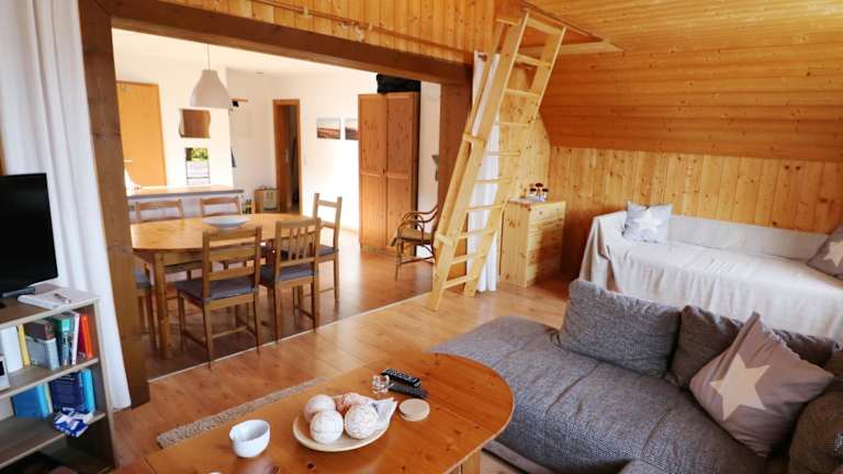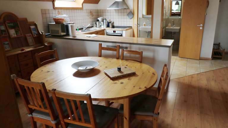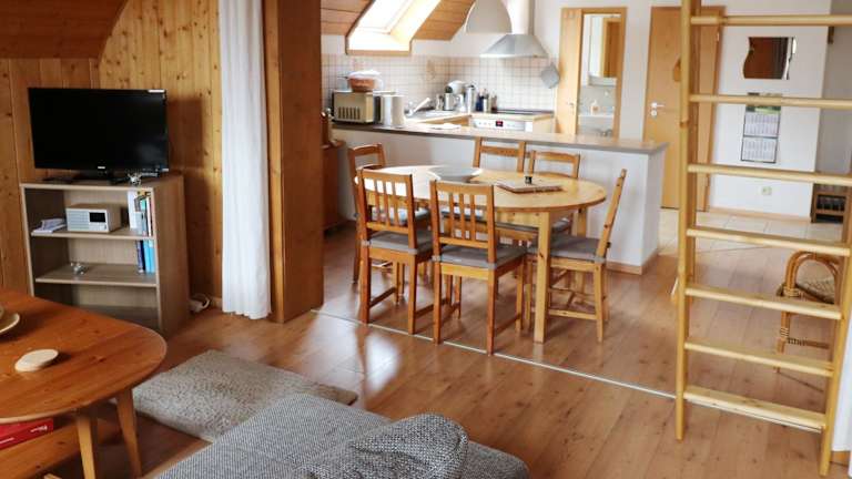 Die Ferienwohnung ist ausgestattet mit einem TV, einer Küchenzeile, die mit einem Kühlschrank, Geschirrspüler, Ofen, Kaffeemaschine und Wasserkocher versehen ist.