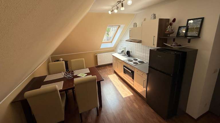 Die Unterkunft umfasst eine gut ausgestattete Küche mit Kühlschrank und Geschirrspüler, jedoch sind weitere Informationen zu Verpflegungsmöglichkeiten nicht angegeben.