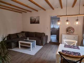 Die Ferienwohnung umfasst ein Schlafzimmer und ein Wohnzimmer. Zur Ausstattung gehören ein Flachbild-TV, eine gut ausgestattete Küche mit Kühlschrank und Geschirrspüler sowie ein Badezimmer mit Dusche. Handtücher und Bettwäsche werden bereitgestellt.