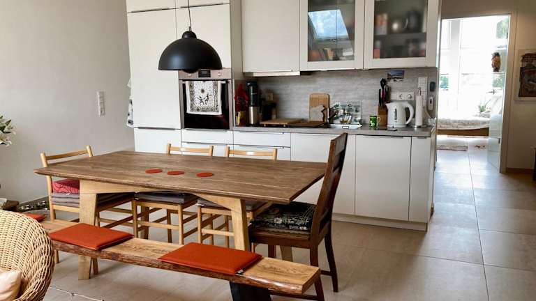 Die Unterkunft ist mit einer gut ausgestatteten Küchenzeile versehen, die einen Kühlschrank, einen Geschirrspüler sowie einen Ofen umfasst, was eine Selbstversorgung ermöglicht.