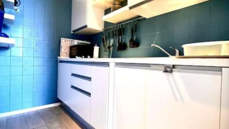 Die Küche der Ferienwohnung ist mit einem Kühlschrank, einem Ofen, einer Herdplatte, einer Kaffeemaschine und einem Wasserkocher ausgestattet, sodass die Zubereitung eigener Mahlzeiten möglich ist.