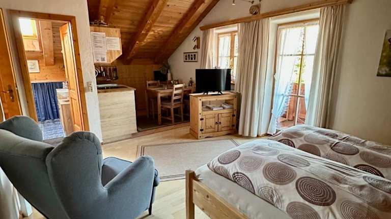 Die Ferienwohnung ist für bis zu zwei Gäste ausgelegt und verfügt über ein Schlafzimmer und ein Badezimmer. Sie ist ausgestattet mit Bettwäsche, Handtüchern, einem Flachbild-TV mit Satellitenkanälen, einem Essbereich sowie einer voll ausgestatteten Küchenzeile. Zudem gibt es einen Balkon mit Bergblick und allergikerfreundliche Zimmer sind verfügbar.