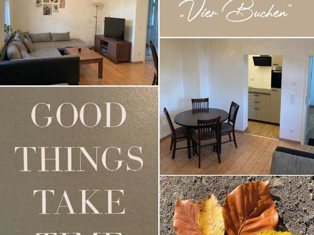 Die Ferienwohnung VIER BUCHEN ist eine komfortable Unterkunft im Erdgeschoss, die einen schönen Blick auf den Garten bietet. Sie bietet Übernachtungsmöglichkeiten mit kostenlosem WLAN und einem kostenlosen Privatparkplatz.
