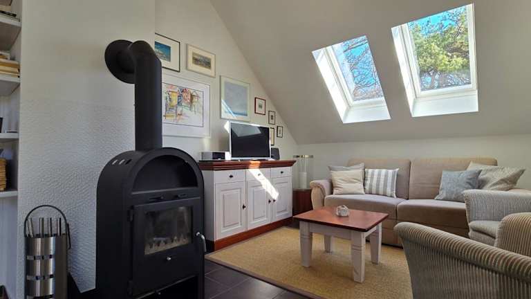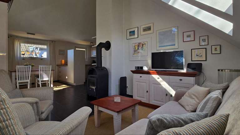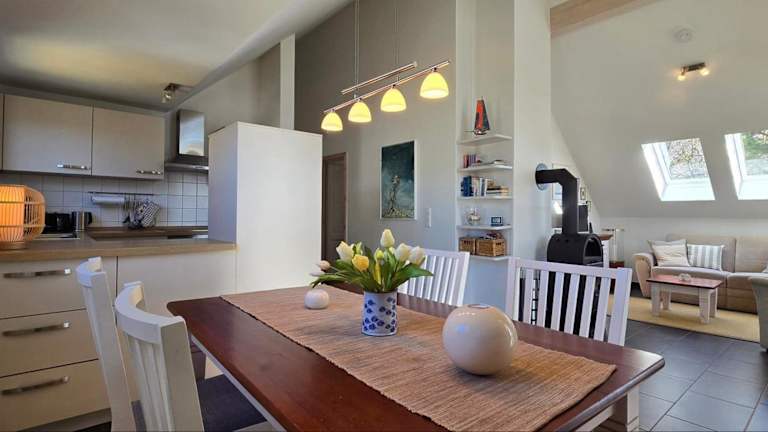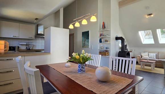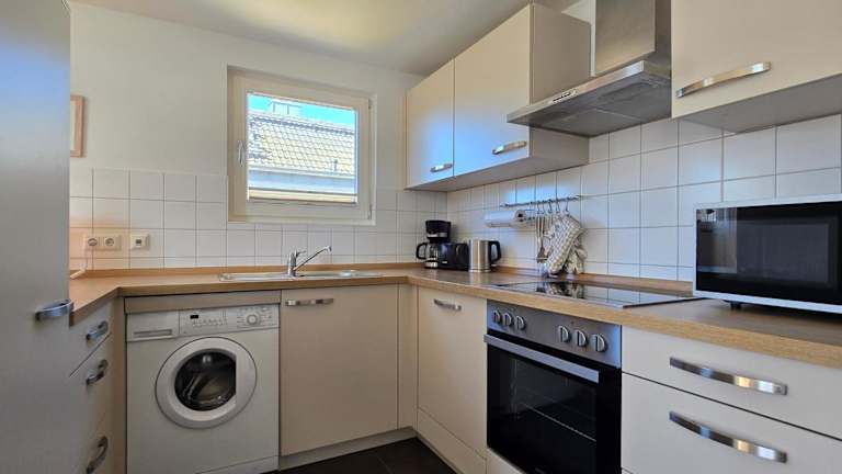 Die Ferienwohnung verfügt über 2 Schlafzimmer und ist mit einem TV sowie einer voll ausgestatteten Küche eingerichtet. Diese Küche umfasst einen Kühlschrank, einen Geschirrspüler, eine Waschmaschine, einen Ofen und eine Herdplatte.