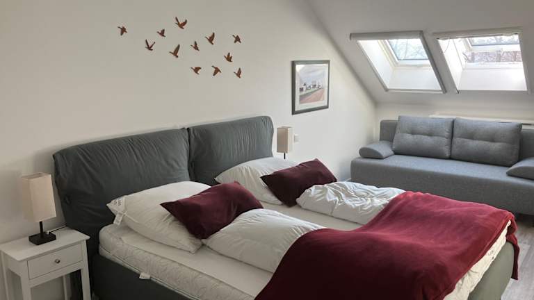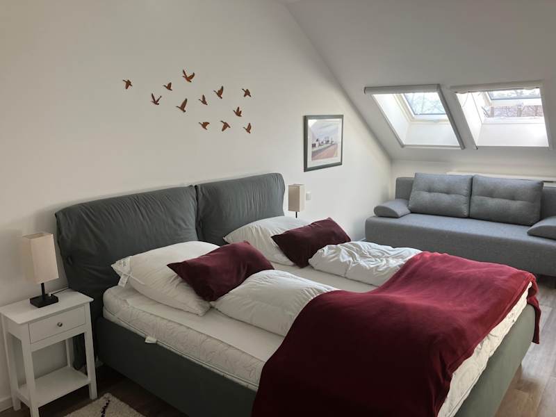 Die Ferienwohnung besteht aus zwei Schlafzimmern, einem Wohnzimmer und einer voll ausgestatteten Küchenzeile, die unter anderem einen Kühlschrank und eine Kaffeemaschine umfasst. Zu den weiteren Annehmlichkeiten zählen zwei Badezimmer mit Dusche und Haartrockner sowie ein Flachbild-TV. Die Ferienwohnung verfügt zudem über einen Balkon.