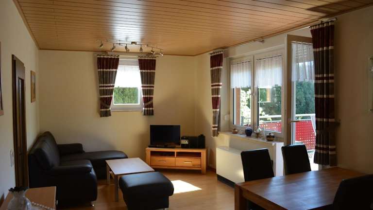 Die Ferienwohnung Weber bietet ein gemütliches und gut ausgestattetes Apartment. Das Schlafzimmer ist komfortabel eingerichtet und lädt zum Entspannen ein. Das Badezimmer ist modern und verfügt über alle notwendigen Annehmlichkeiten. Im Wohnbereich finden Sie einen Flachbild-Sat-TV, der Ihnen Unterhaltung bietet, sowie einen Essbereich, an dem Sie Ihre Mahlzeiten einnehmen können. Die voll ausgestattete Küche ermöglicht es Ihnen, Ihre eigenen Mahlzeiten zuzubereiten und sich wie zu Hause zu fühlen. Der Balkon bietet einen herrlichen Blick auf den Fluss und lädt zum Verweilen ein.