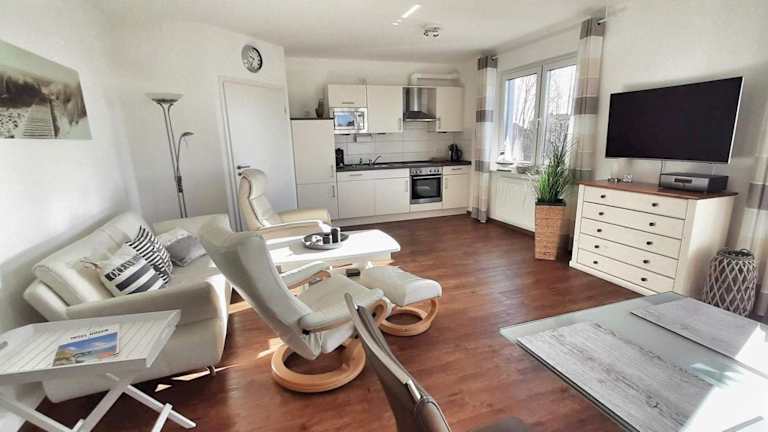 Die Ferienwohnung Wellenreiter bietet ein komfortables Apartment mit einem Schlafzimmer, einem Wohnzimmer und einem Balkon mit Blick auf die Stadt. Das Apartment verfügt über einen Flachbild-TV und kostenfreies WLAN. Die Küche ist mit einem Kühlschrank und einem Geschirrspüler ausgestattet. Im Badezimmer finden Sie eine Dusche. Handtücher und Bettwäsche werden gestellt.