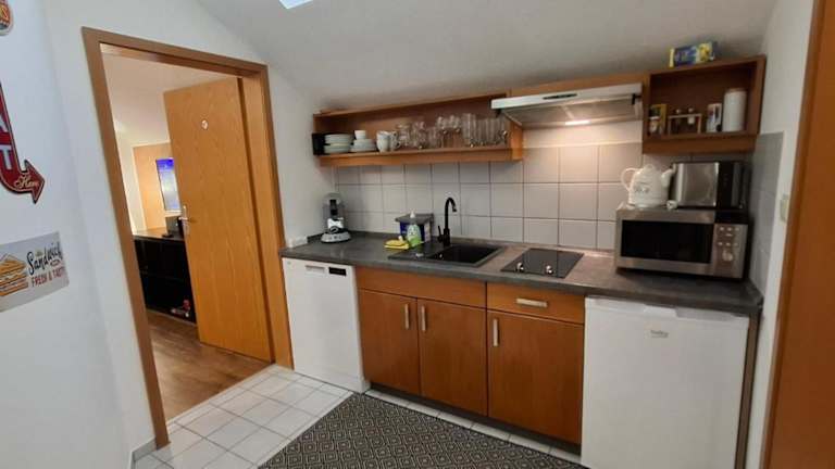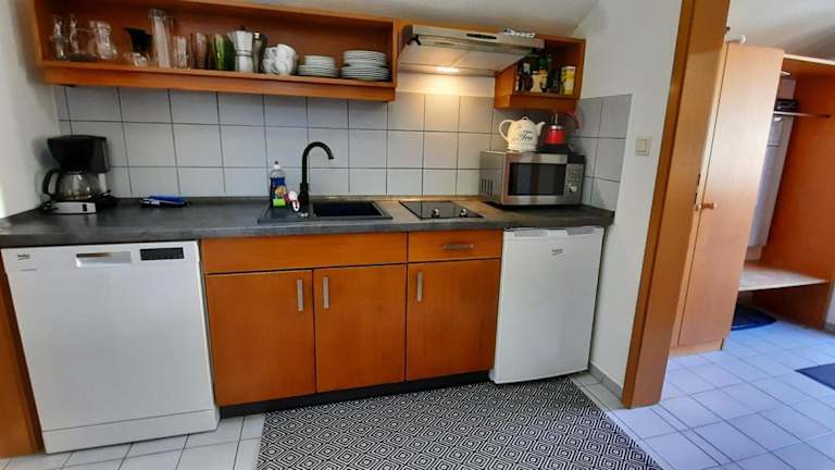 Die Ferienwohnung umfasst ein Schlafzimmer, ein Wohnzimmer, ein Badezimmer mit Badewanne sowie eine gut ausgestattete Küche mit Kühlschrank und Geschirrspüler. Zur Ausstattung gehören außerdem ein Balkon mit Bergblick, ein Flachbild-TV sowie Handtücher und Bettwäsche.