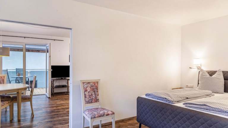 Die Ferienwohnung bietet ein Schlafzimmer, ein Wohnzimmer, einen TV, einen Balkon mit Bergblick sowie ein Badezimmer mit Dusche. Handtücher und Bettwäsche werden bereitgestellt.