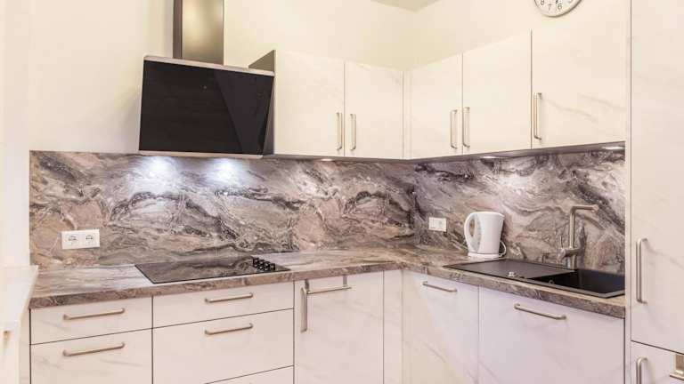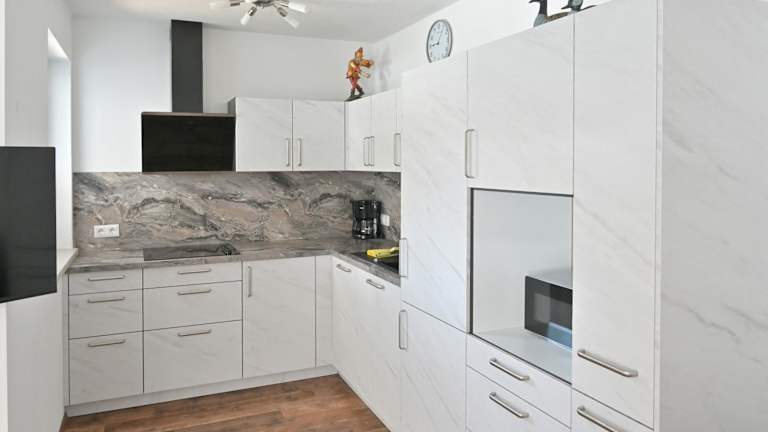 Die voll ausgestattete Küche der Ferienwohnung beinhaltet einen Kühlschrank und einen Geschirrspüler.