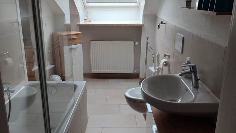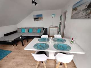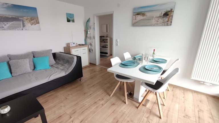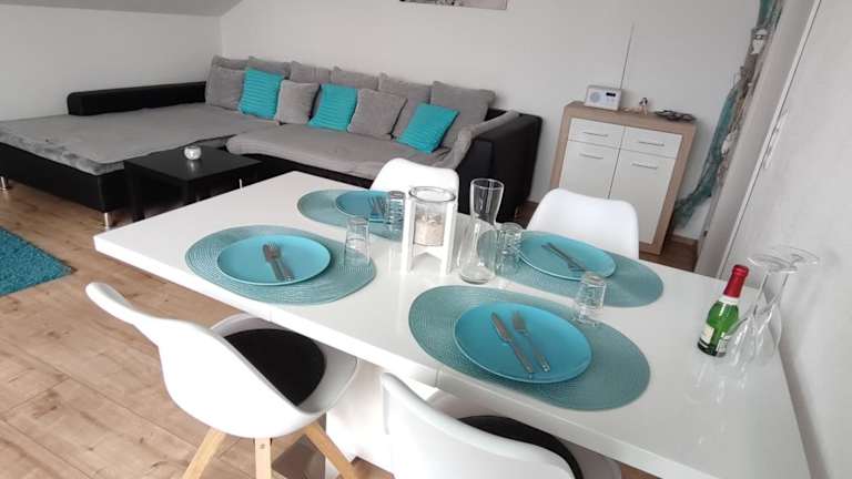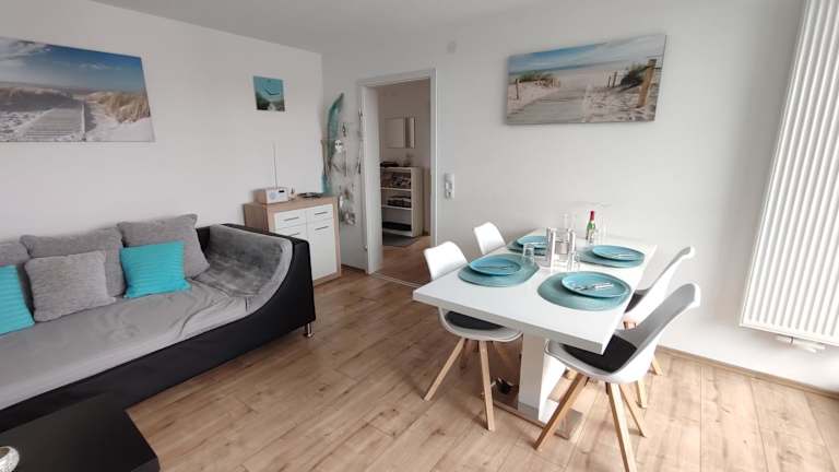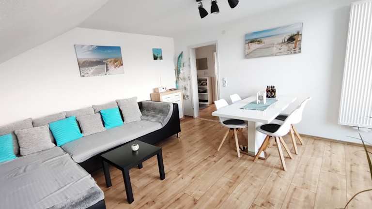 Die Ferienwohnung verfügt über eine gut ausgestattete Küche mit Kühlschrank, Geschirrspüler und Ofen. Es gibt ein Wohnzimmer mit Sitz- und Essbereich, 2 Schlafzimmer sowie ein Badezimmer mit Dusche und Badewanne. Handtücher und Bettwäsche werden bereitgestellt. Zudem ist eine Spielekonsole vorhanden.
