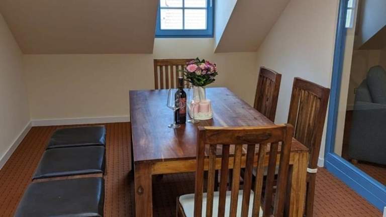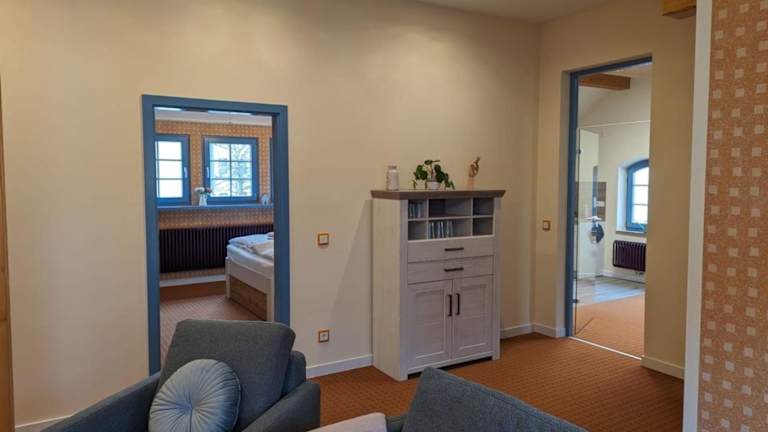 Die Ferienwohnung umfasst zwei Schlafzimmer, ein Wohnzimmer sowie eine voll ausgestattete Küche mit Kühlschrank und Kaffeemaschine. Des Weiteren gibt es ein Badezimmer mit Dusche und Haartrockner. Handtücher und Bettwäsche werden bereitgestellt.
