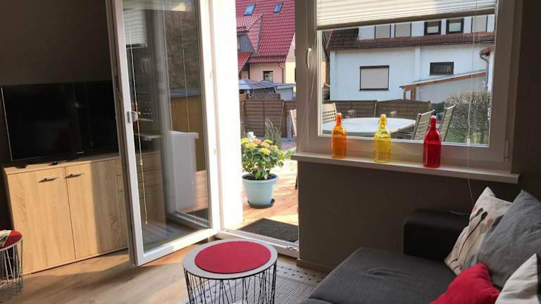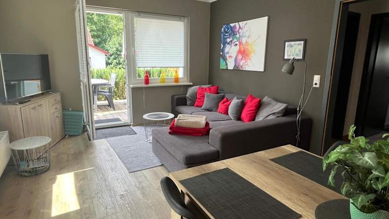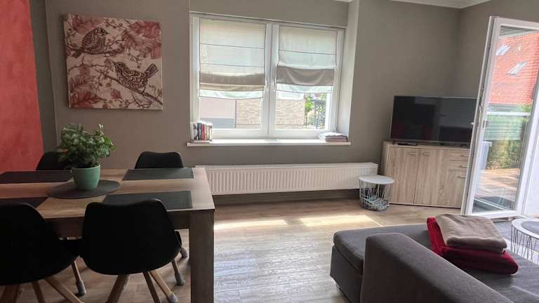 Die Ferienwohnung bietet Platz für bis zu 4 Personen und verfügt über 2 Schlafzimmer, ein gemütliches Wohnzimmer, eine voll ausgestattete Küche und ein Badezimmer. Die Küche ist mit einem Kühlschrank und einer Kaffeemaschine ausgestattet, so dass Sie Ihre Mahlzeiten bequem zubereiten können. Handtücher und Bettwäsche werden gestellt, so dass Sie sich um nichts kümmern müssen. Die Terrasse lädt zum Entspannen im Freien ein und der schöne Garten bietet eine grüne Oase der Ruhe.