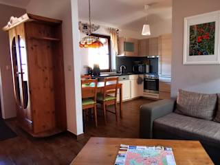 Die Ferienwohnungen sind mit einer voll ausgestatteten Küche ausgestattet. Diese umfasst einen Kühlschrank, einen Geschirrspüler, einen Ofen, eine Mikrowelle, eine Herdplatte sowie eine Kaffeemaschine und einen Wasserkocher. Es noch keine spezifischen Informationen zu weiteren Verpflegungsmöglichkeiten vorliegend.