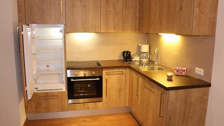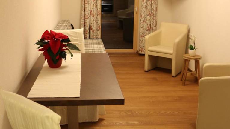 Die Wohnung ist ausgestattet mit einem Schlafzimmer, einem Wohnzimmer, einer voll ausgestatteten Küche, die einen Kühlschrank und einen Essbereich umfasst, sowie einem Badezimmer. Handtücher und Bettwäsche werden bereitgestellt, und es gibt einen Abstellraum für Skier.