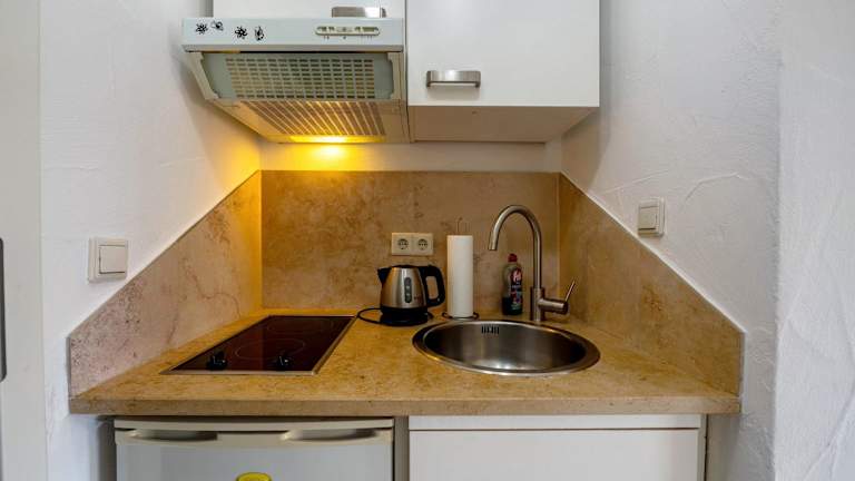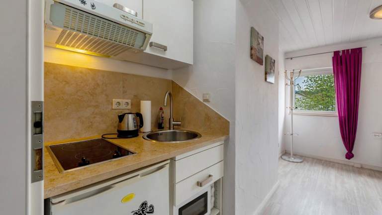 Es sind Kochmöglichkeiten in der voll ausgestatteten Küche vorhanden, die unter anderem mit einem Kühlschrank, einer Mikrowelle, einer Herdplatte und einem Wasserkocher ausgestattet ist.