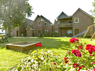 Zehn geschmackvoll, modern und maritim eingerichtete Ferienwohnungen mit 1 oder 2 Schlafräumen für 1-3 oder 2-5 Personen warten auf Sie! Während Ihre Kinder im großen Garten, mit Schaukel und Sandkasten, spielen oder auf dem Riesentrampolin hüpfen, genießen Sie die Zeit auf der Terrasse oder im Strandkorb. Lassen Sie bei einem „guten Buch“ oder einfach nur so die Seele baumeln und genießen die Ruhe. Lust auf Grillen?? Unsere zum Teil überdachte Gemeinschaftsterrasse verfügt über einen Grill, den Sie gerne für Ihren Grillabend nutzen können. Direkt am Haus steht für jede Wohnung ein PKW-Einstellplatz zur Verfügung und es gibt eine Unterstellmöglichkeit für Fahrräder mit Ladestation für Ihr E-Bike. Sollte Ihre Wäsche knapp werden, können Sie gerne, gegen eine geringe Gebühr, die bereitstehende Waschmaschine nutzen.