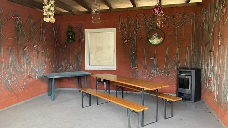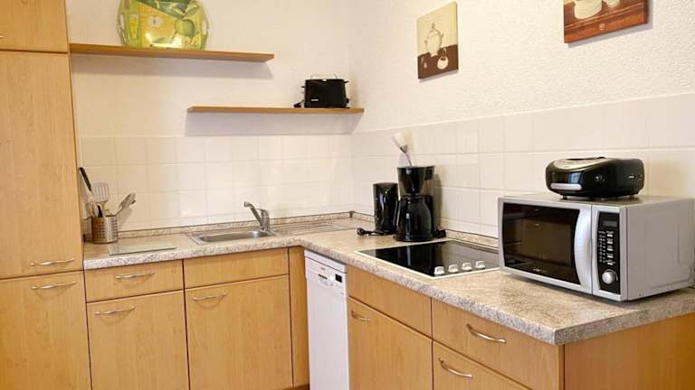 In der Ferienwohnung steht eine voll ausgestattete Küche zur Verfügung, die es Gästen ermöglicht, Mahlzeiten selbst zuzubereiten. Hierzu finden sich ein Kühlschrank und ein Geschirrspüler.