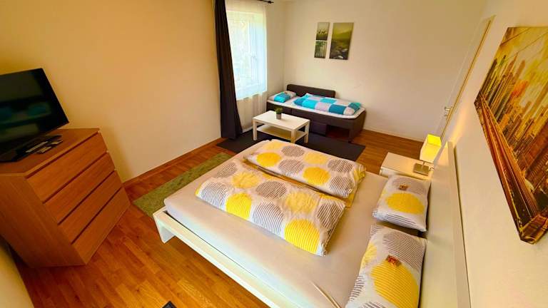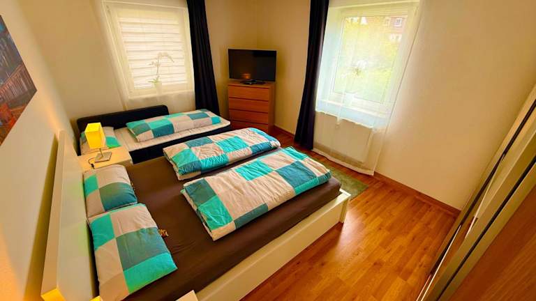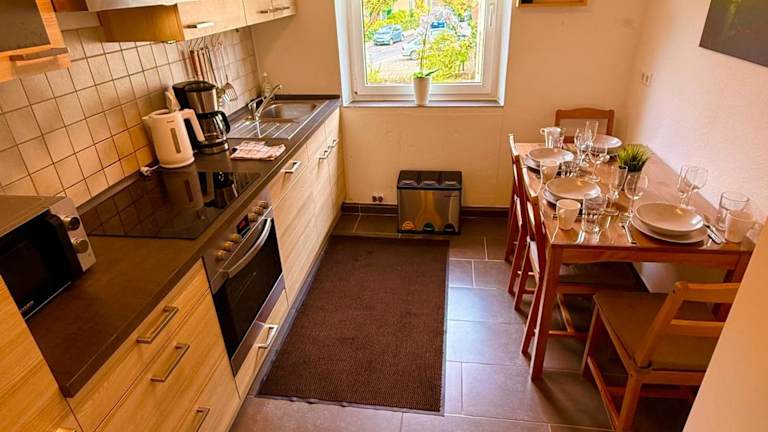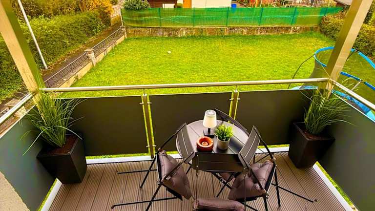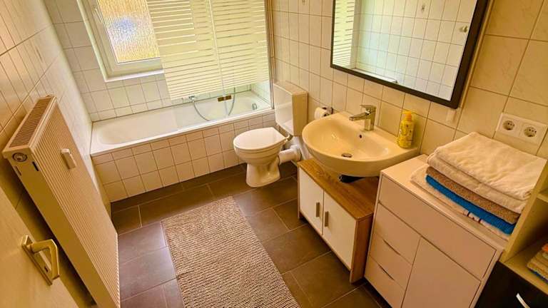 Die Ferienwohnung verfügt über 3 Schlafzimmer und 1 Badezimmer. Bettwäsche und Handtücher werden gestellt. Zur weiteren Ausstattung gehören ein Flachbild-TV, ein Essbereich, eine voll ausgestattete Küche und ein Balkon mit Blick auf den Garten.