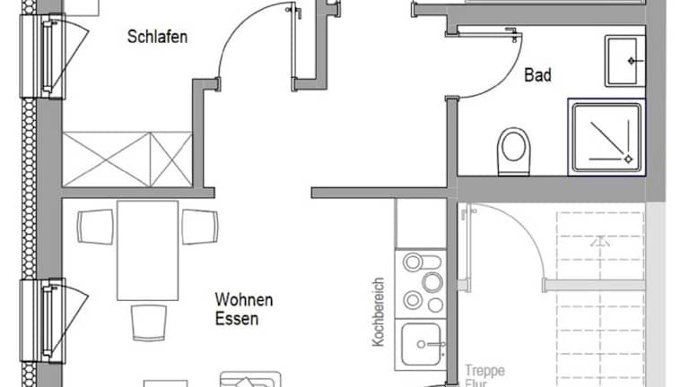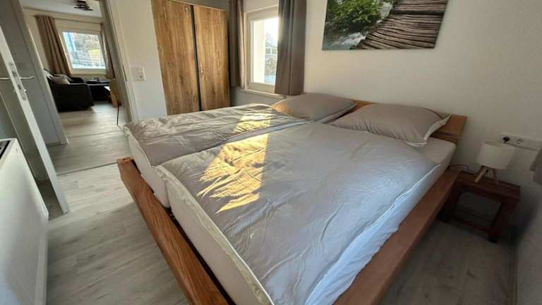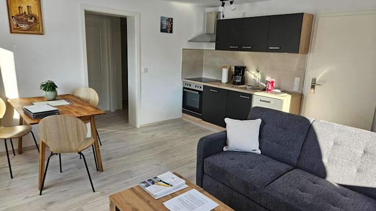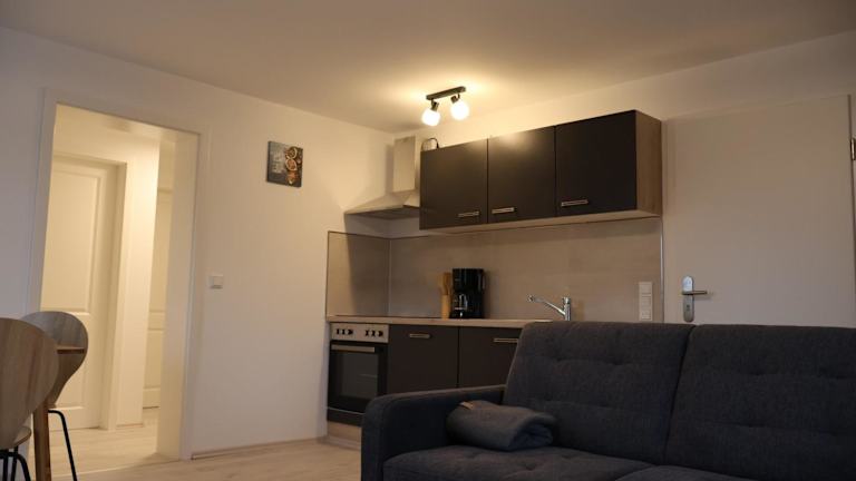 Die Küchenzeile in den Ferienwohnungen ist umfangreich ausgestattet. Sie umfasst einen Kühlschrank, einen Geschirrspüler und einen Ofen. Zusätzlich sind eine Mikrowelle, Herdplatten, ein Toaster, eine Kaffeemaschine sowie ein Wasserkocher vorhanden, sodass Selbstversorgung leicht möglich ist.