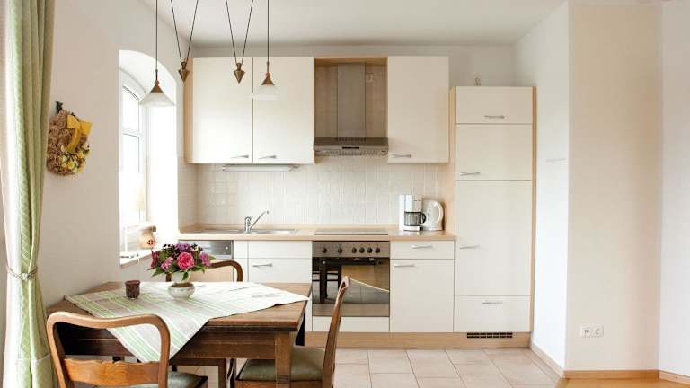 Die Küchenzeile der Unterkunft ist ausgestattet mit einem Kühlschrank, Geschirrspüler, Ofen sowie einer Kaffeemaschine und einem Wasserkocher, was Selbstverpflegung ermöglicht.