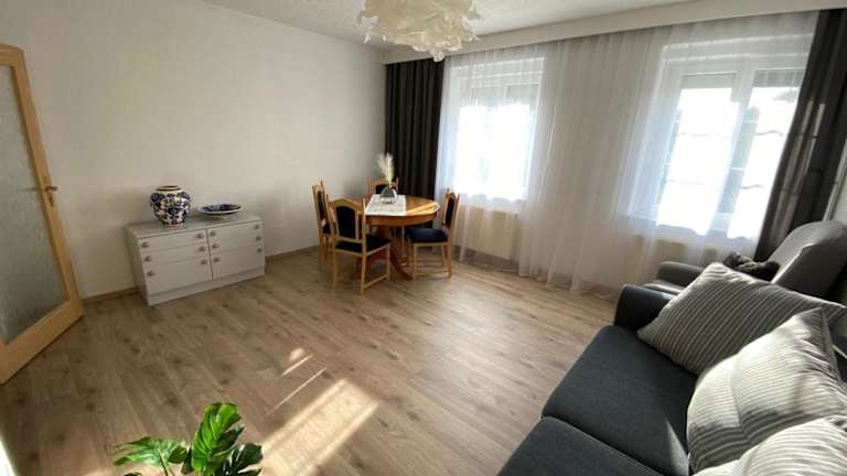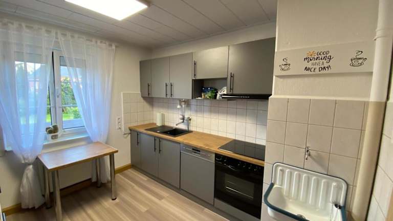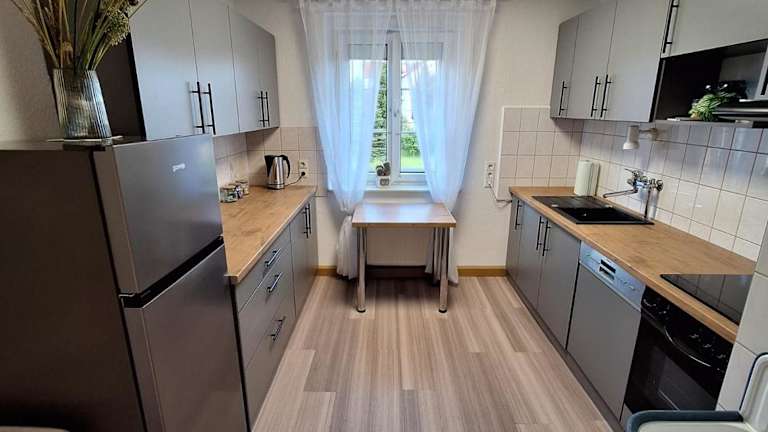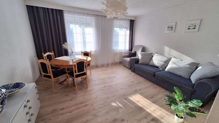 Die Ferienwohnung umfasst zwei Schlafzimmer, einen TV, einen Essbereich sowie eine Küche, die mit einem Kühlschrank ausgestattet ist. Zudem gibt es ein Wohnzimmer. Handtücher und Bettwäsche werden bereitgestellt.