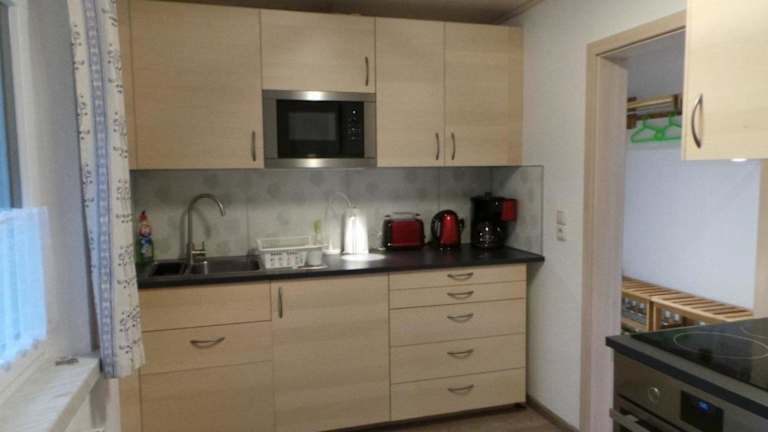 Die Ferienwohnung ist ausgestattet mit zwei Schlafzimmern, einer voll ausgestatteten Küche mit Ofen und Mikrowelle sowie einem Badezimmer mit Dusche und Haartrockner. Handtücher und Bettwäsche werden bereitgestellt.
