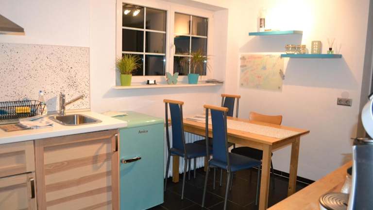 In der Fewo Grenzach sind Küchenzeilen mit Kühlschrank, Herdplatte, Toaster, Kaffeemaschine und Wasserkocher vorhanden, sodass Gäste ihre Mahlzeiten selbst zubereiten können. Ein Essbereich ist ebenfalls vorhanden, um gemütliche Essen zu genießen.