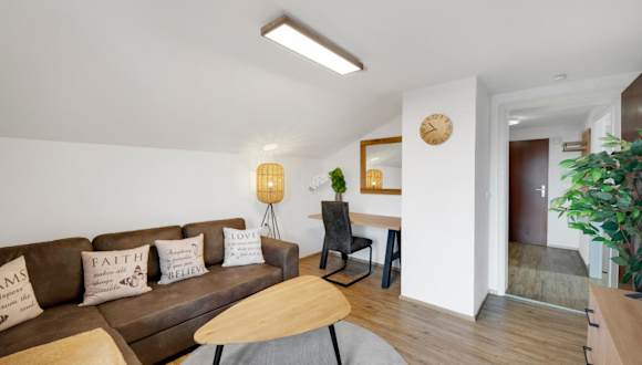 Die Ferienwohnung verfügt über ein Schlafzimmer, ein Wohnzimmer und ein Badezimmer mit Dusche. Zur Ausstattung gehören ein Flachbild-TV sowie eine gut ausgestattete Küche einschließlich Kühlschrank und Geschirrspüler. Ein Balkon mit Bergblick ist ebenfalls vorhanden.