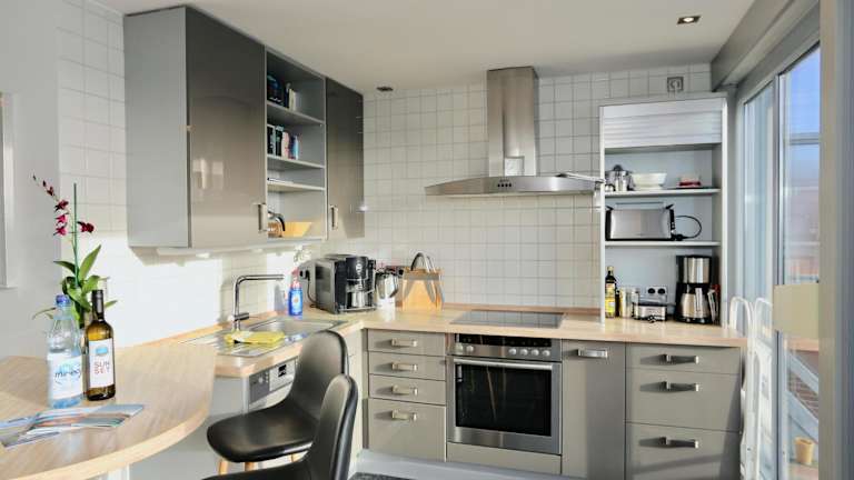 Die Ferienwohnung verfügt über 2 Schlafzimmer und 1 Badezimmer. Zur Ausstattung gehören Bettwäsche, Handtücher, ein Flachbild-TV mit Kabelkanälen und eine Kaffeemaschine. Zudem stehen den Gästen eine Terrasse mit Meerblick und Allergikerfreundliche Zimmer zur Verfügung.