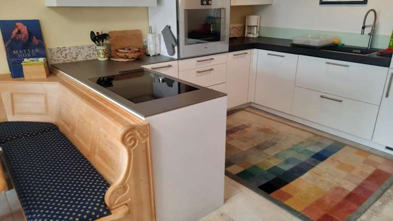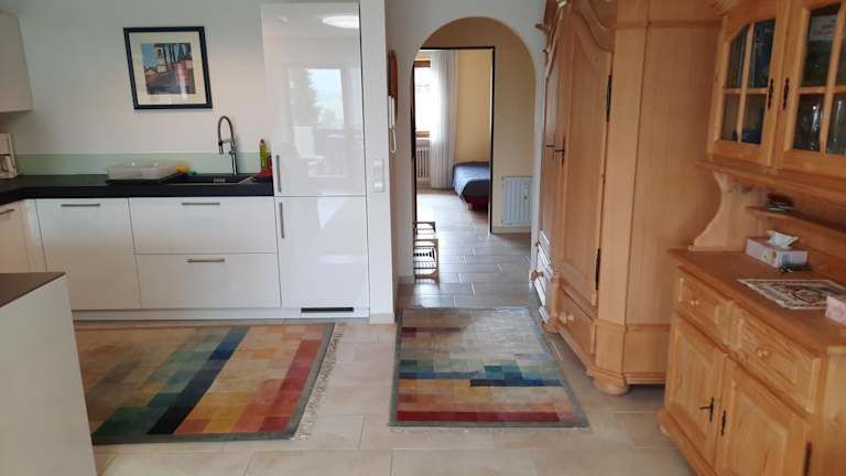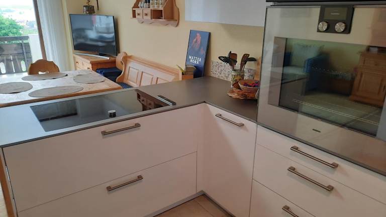 Die Ferienwohnung ist mit einer Küchenzeile ausgestattet, die einen Kühlschrank, einen Geschirrspüler, einen Ofen, eine Kaffeemaschine und einen Wasserkocher beinhaltet.