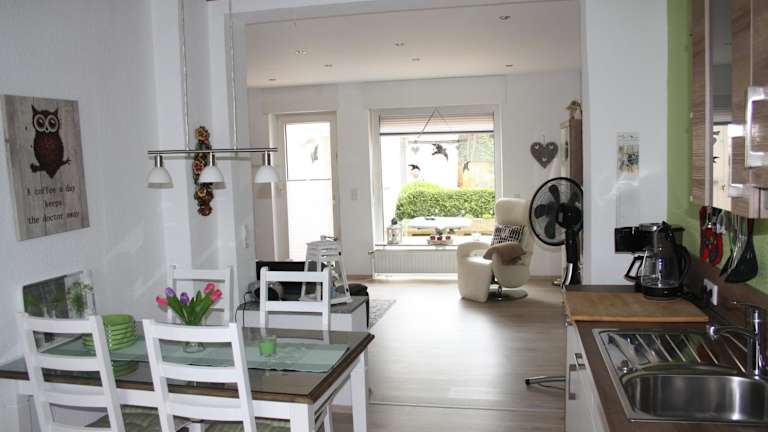 Die Ferienwohnung verfügt über 2 Schlafzimmer, ein Wohnzimmer, ein Badezimmer mit Dusche sowie eine gut ausgestattete Küche mit Kühlschrank und Geschirrspüler. Zur Ausstattung gehören außerdem ein Flachbild-TV sowie Handtücher und Bettwäsche.