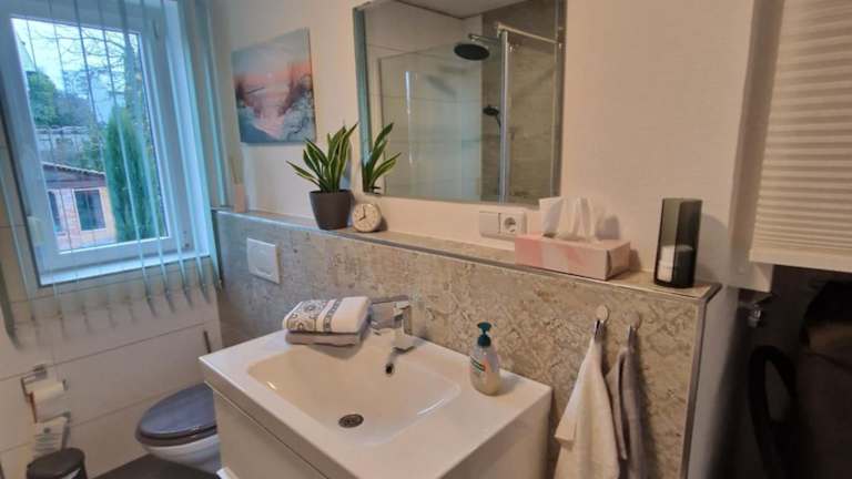 Das Apartment im FeWo M&M Veitshöchheim verfügt über 1 Schlafzimmer, ein Wohnzimmer, einen Balkon mit Poolblick und eine voll ausgestattete Küche. Das Apartment ist gemütlich eingerichtet und bietet einen Flachbild-TV sowie ein eigenes Bad mit einer Dusche. Handtücher und Bettwäsche werden gestellt, so dass Sie sich um nichts kümmern müssen.