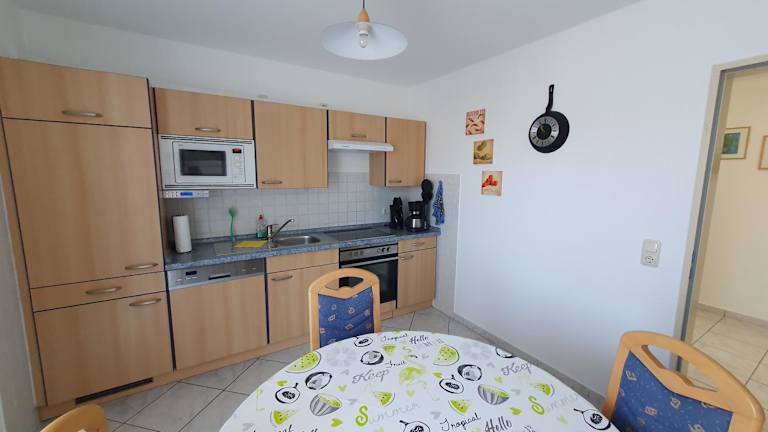 Die Ferienwohnung hat einen Wohnraum mit einem TV und bietet ein Schlafzimmer sowie ein Badezimmer mit einer Dusche. Die voll ausgestattete Küche verfügt über einen Kühlschrank und einen Geschirrspüler.