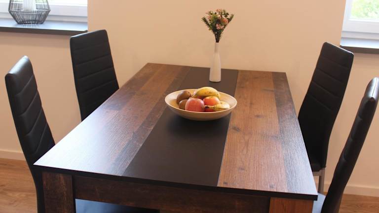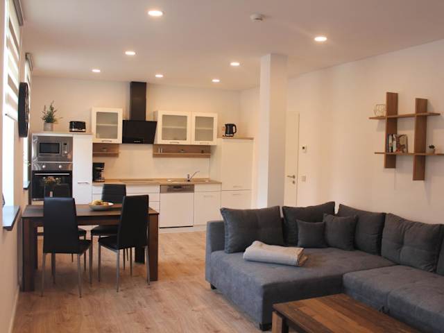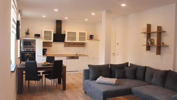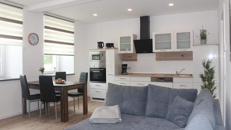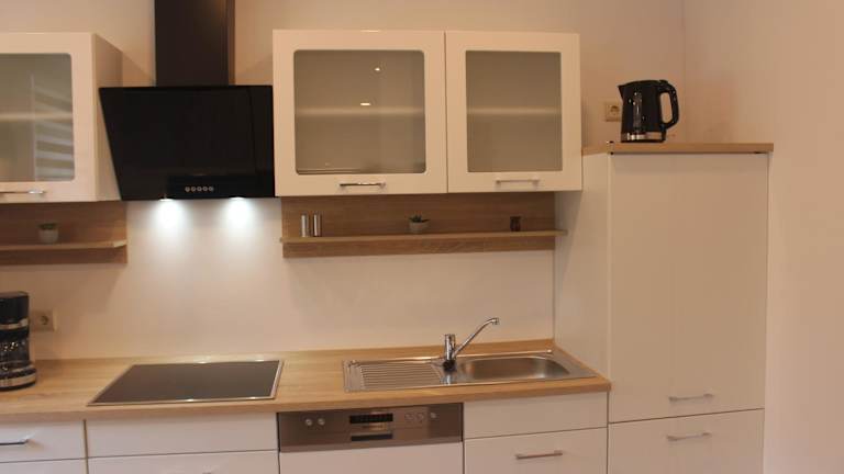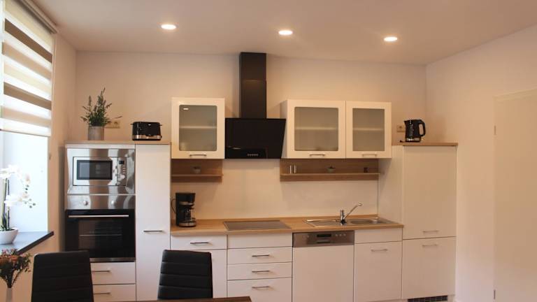 Die Wohneinheiten verfügen über eine voll ausgestattete Küche mit einem Esstisch, in der die Gäste selbstständig Mahlzeiten zubereiten können. Zur Ausstattung gehören ein Kühlschrank, Geschirrspüler, Ofen, Kaffeemaschine und Wasserkocher.