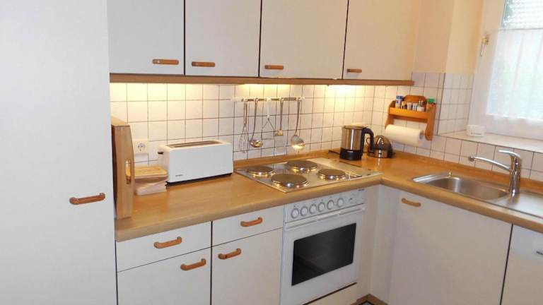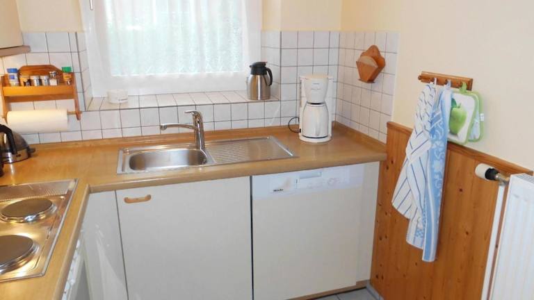Die Ferienwohnung verfügt über eine voll ausgestattete Küche mit einem Kühlschrank, Geschirrspüler, Waschmaschine, Ofen und Herdplatte, die den Gästen die Möglichkeit bietet, selbst zu kochen.