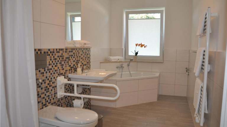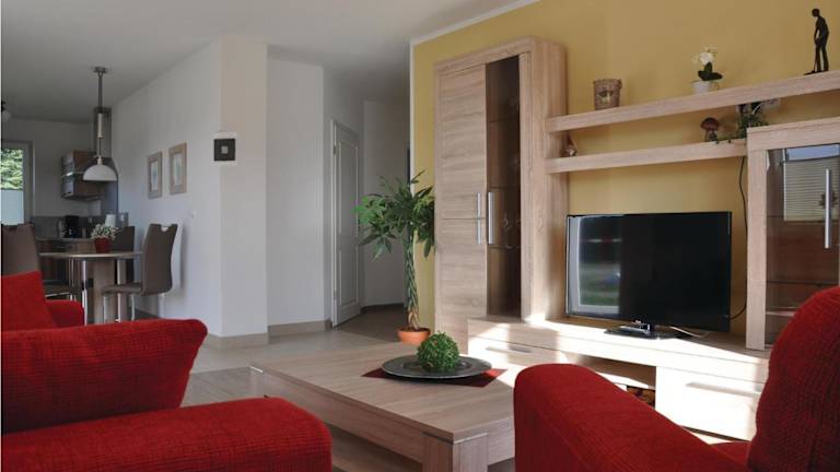 Die Ferienwohnung umfasst zwei Schlafzimmer, ein Wohnzimmer und eine voll ausgestattete Küche, die mit einem Kühlschrank und einer Kaffeemaschine ausgestattet ist. Des Weiteren gibt es ein Badezimmer mit Dusche und Badewanne. Ein TV ist ebenfalls vorhanden.
