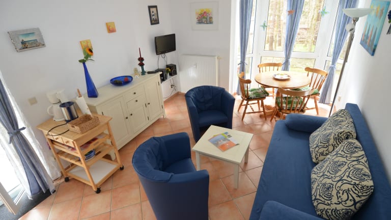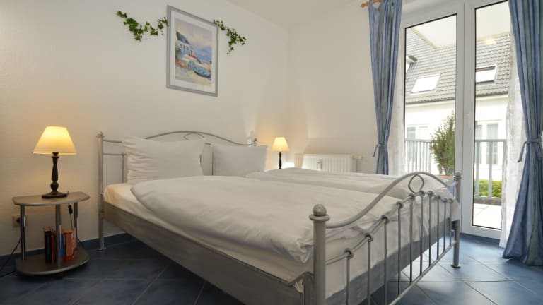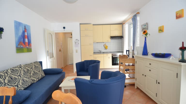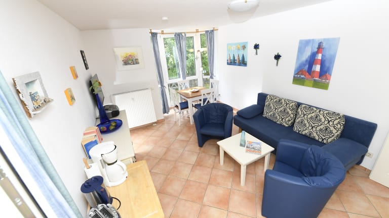 WG 2: Das 2-Raum-Appartement im 1. Obergeschoss des Hauses Nr. 8 verfügt über ca. 41 m² Wohnfläche, einen Wohnraum mit Küchenzeile, ein Duschbad, ein Schlafzimmer mit einem Doppelbett und einen großen bestuhlten Balkon (13 m²). Es ist für 1-4 Personen buchbar.
