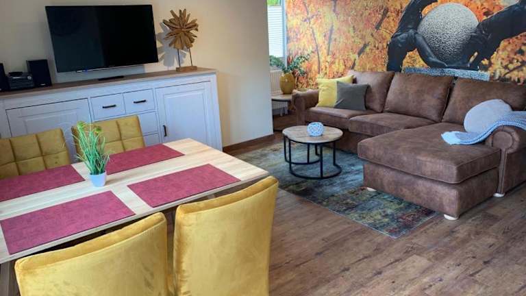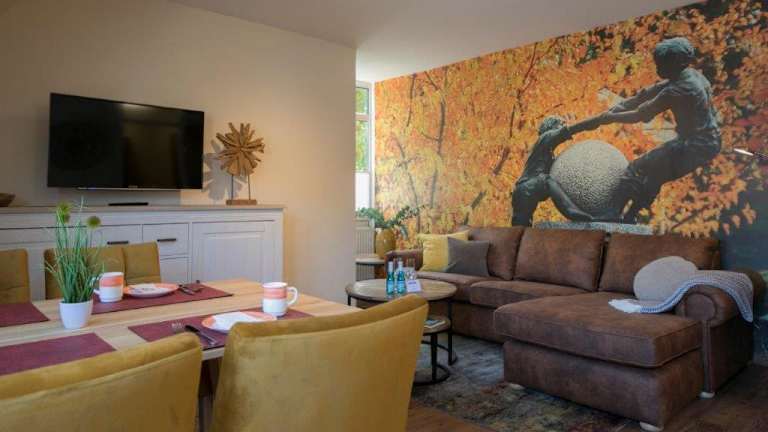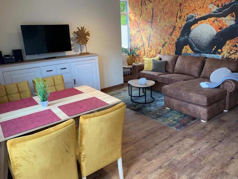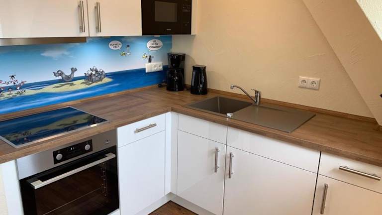Die Ferienwohnung umfasst ein Wohnzimmer und eine voll ausgestattete Küche, die über einen Kühlschrank und einen Geschirrspüler verfügt. Zur Ausstattung gehören weiterhin ein Fernseher mit Kabelkanälen und ein CD-Player.